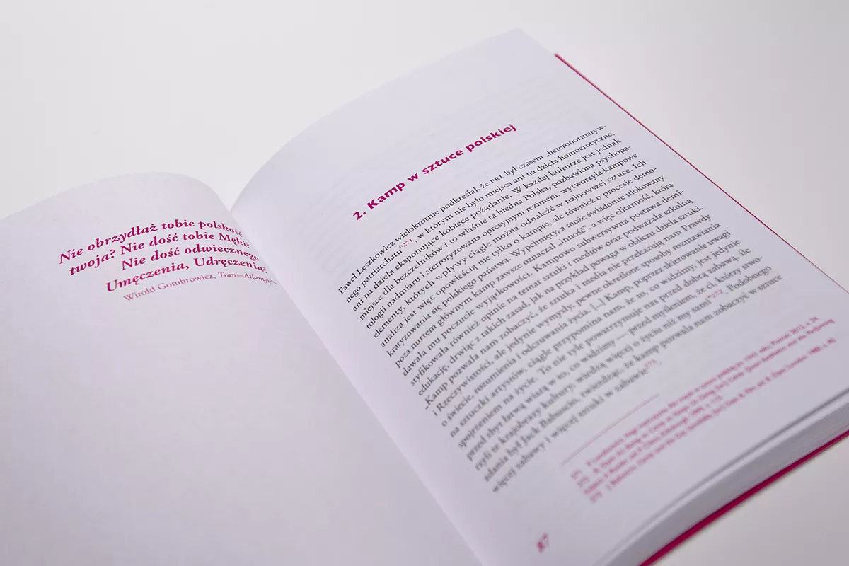 Kampowy powiew, jaki poczuje czytelnik tej książki, przypomina o przyjemnościach i ósmym dniu tygodnia. Dzisiaj — na ruinach nowoczesności — nie musimy wszak ciągle czekać na spełnienie i odsuwać radości na potem. Czytanie wywrotowego tekstu Ani England uświadamia, co utraciliśmy w dotychczasowych modelach uspołeczniania: brzemię odpowiedzialności pozbawiło nas niefrasobliwości, lekkości i trzpiotowatej frenezji. Ciotki–klotki, dandysi i odmieńcy walczą o te utracone błahostki i smaki, a ostatecznie — upominają się o wolność, i to bez karabinu i przelewania krwi. Nie boją się przy tym żenady i utraty autorytetu. Kampować można zacząć w każdej chwili, a rozpocząć najlepiej od niniejszej książki. Przewija się tu cała armia bezsilnych, gołych i wesołych: artystów ku pokrzepieniu serc. / prof. Anna Markowska, Uniwersytet Wrocławski