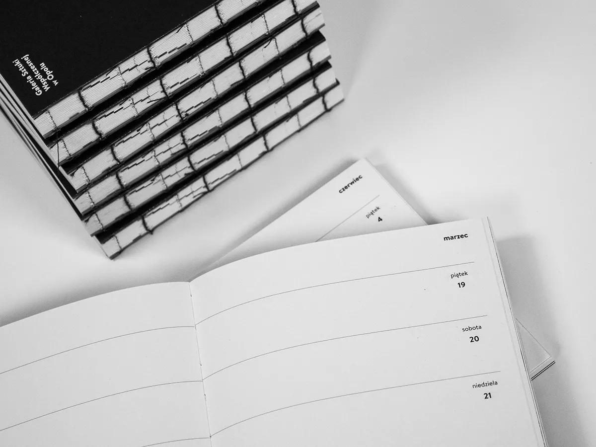 Kalendarz wykonany jest w przyjemnym, podręcznym formacie z miękką okładką i odkrytym grzbietem. Rozkładany “na płasko” co pozwala na wygodne prowadzenie zapisków i notatek. Wykonany z papieru o ciepłym kolorze.