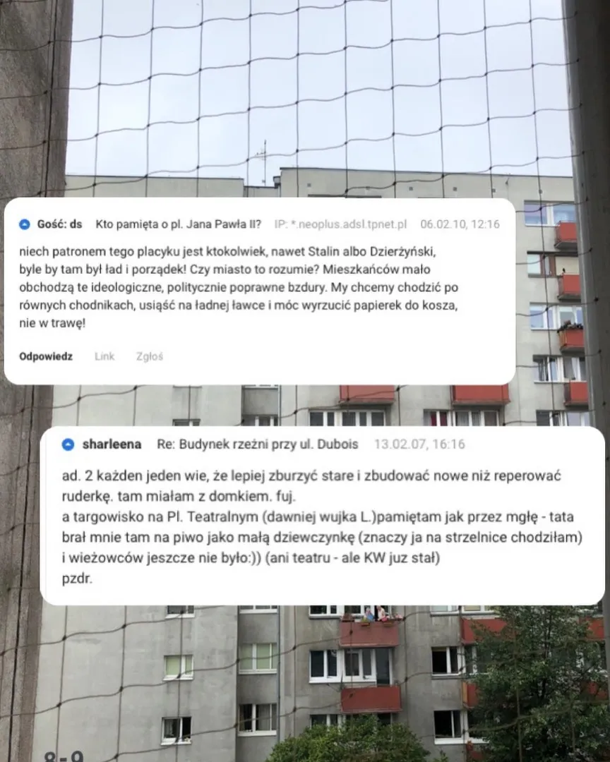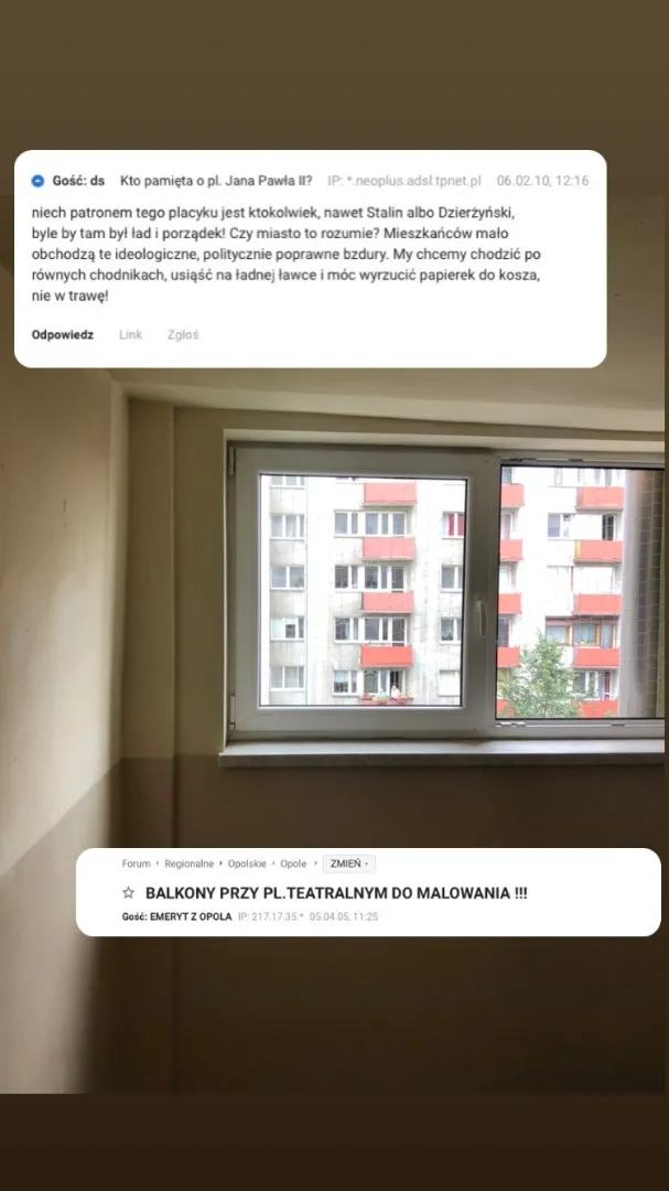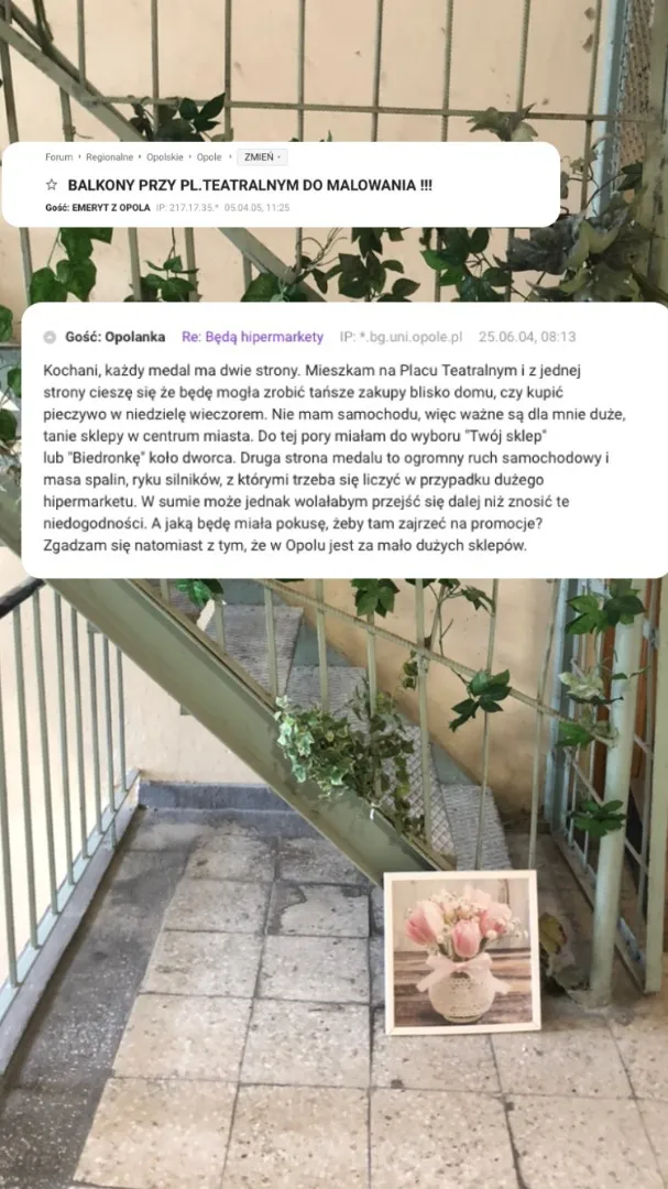 W ramach swojego projektu badawczego artystka przeszukała również zasoby internetu, w szczególności fora internetowe (m.in. gazeta.pl). Dotarła do wielu ciekawych zapisków na temat tego, jak mieszka się w tym miejscu i jakie są jego główne atrakcje i zalety. Jedna z najcenniejszych informacji, odkrytych podczas badania, dotyczy tego, że „Napoje FRUGO są w ciągłej sprzedaży w Rossmanie, przynajmniej w Opolu na Placu Teatralnym…”. Artystka dowiedziała się także, że słonecznik kupowany na znajdującym się tutaj kiedyś targowisku był swego czasu ulubionym przysmakiem stadionowym opolskich kibiców.