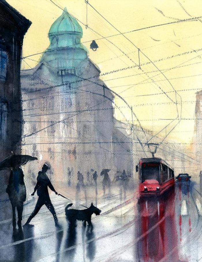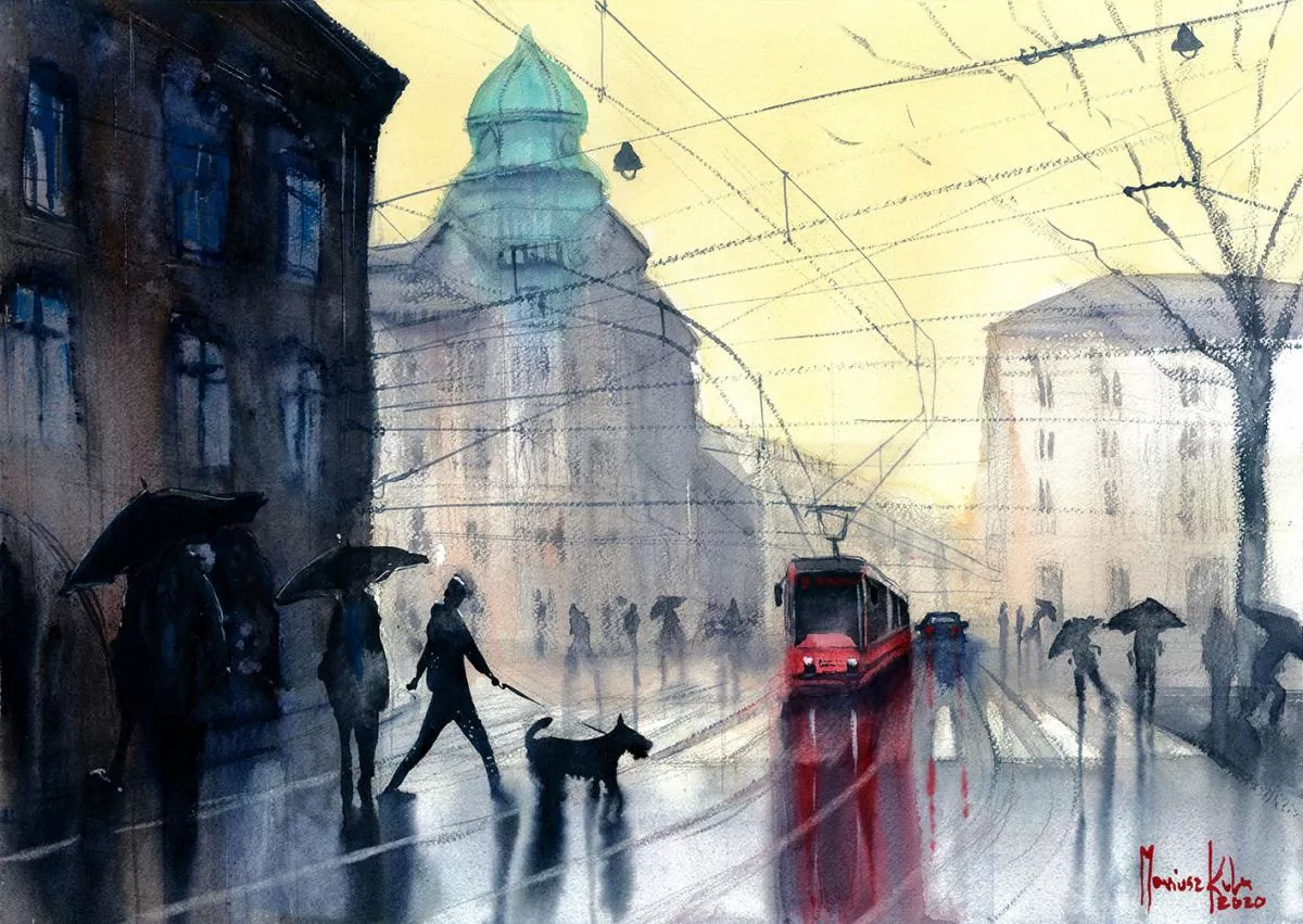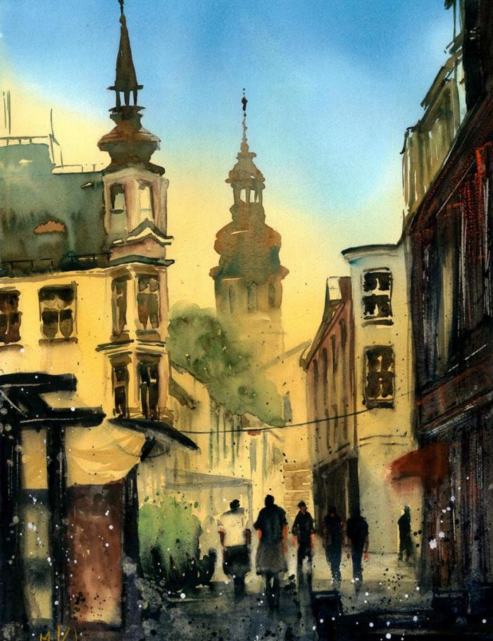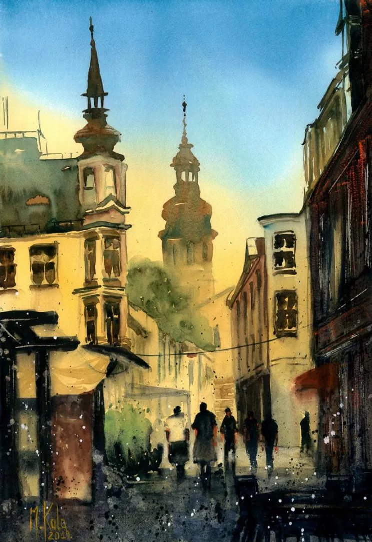 Głównie zajmuję się akwarelą starając się w jak największym stopniu zrozumieć tą niełatwą technikę. Eksperymentuje z różnymi stylami i tematami w akwareli tak by jak najbardziej rozwinąć się. Wymaga to ode mnie sporej otwartości i elastyczności co nie zawsze jest proste :) Najbardziej "czuję się" w kategorii Cityscape czyli miejskim pejzażu. Uwielbiam miejskie, zaklęte rewiry, monumentalne budynki, przechodniów zajętych swoimi sprawami, zróżnicowane warunki atmosferyczne potrafiące to samo miejsce po wielokroć przedstawiać w odmienny sposób.